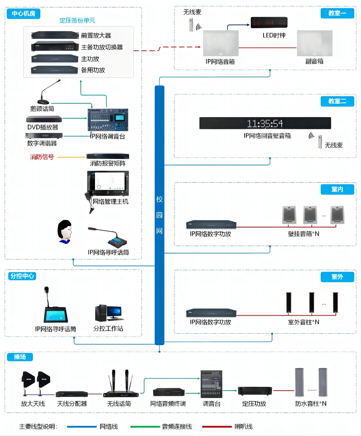 嚴(yán)格按照學(xué)校要求,結(jié)合學(xué)校的建筑結(jié)構(gòu)及相關(guān)設(shè)計(jì)標(biāo)準(zhǔn)進(jìn)行規(guī)范設(shè)計(jì),融合“日常廣播、教學(xué)廣播、管理廣播、分控廣播、教室擴(kuò)聲、操場擴(kuò)聲、雙向?qū)χv、信息發(fā)布”等功能于一體的綜合性校園廣播系統(tǒng),集成了定時(shí)自動(dòng)打鈴、教室多媒體擴(kuò)聲、教學(xué)擴(kuò)聲、雙向可視對講、多級分控管理、音頻實(shí)時(shí)采播等國際先進(jìn)多媒體技術(shù)在教育教學(xué)中的最新應(yīng)用。