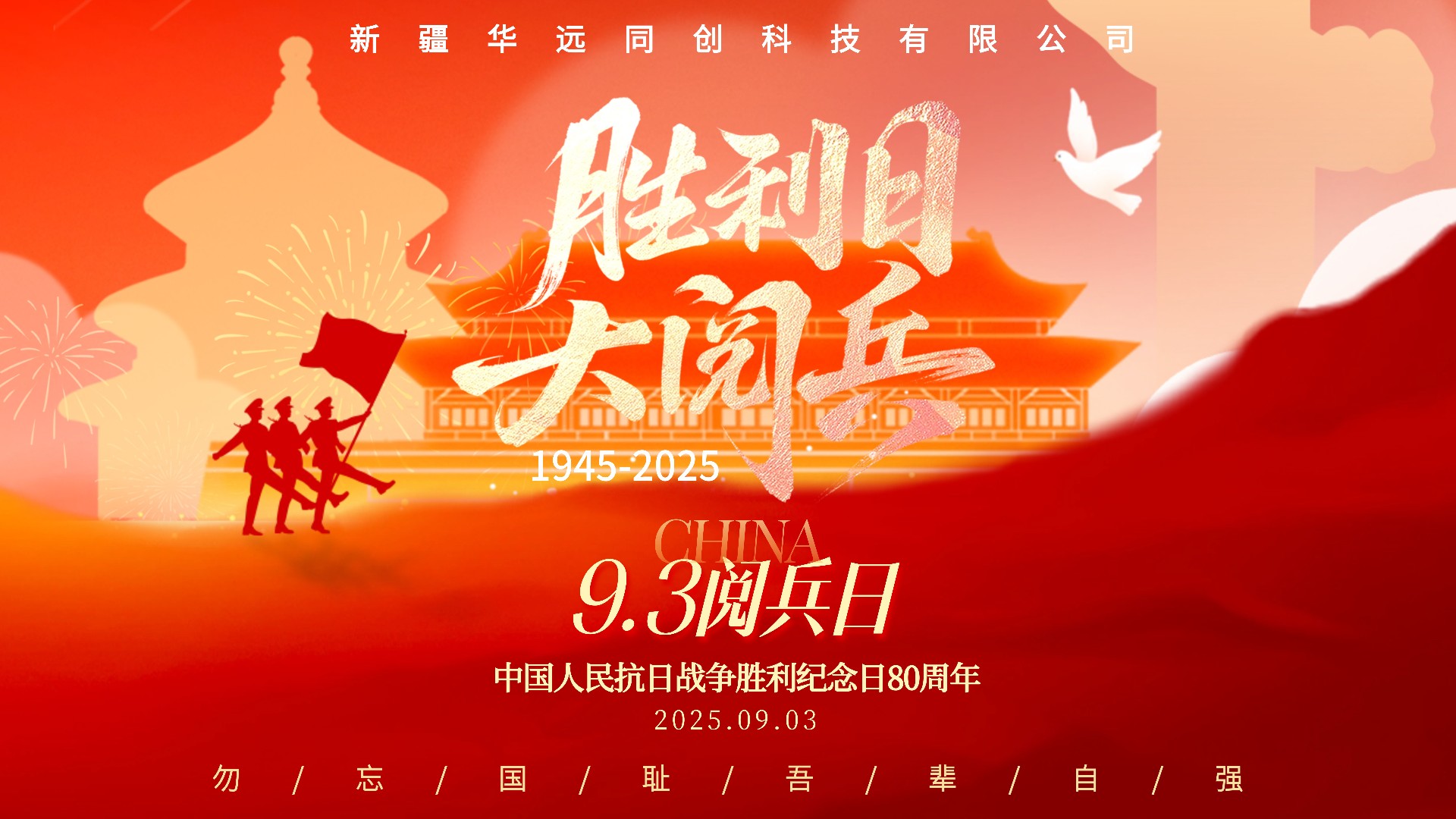 2025年9月3日上午9時,新疆華遠同創科技有限公司組織全體員工集中觀看“九三閱兵式”直播,紀念中國人民抗日戰爭暨世界反法西斯戰爭勝利80周年,共同見證這一場恢宏而莊嚴的國家盛典。